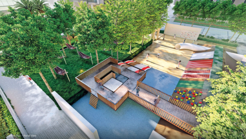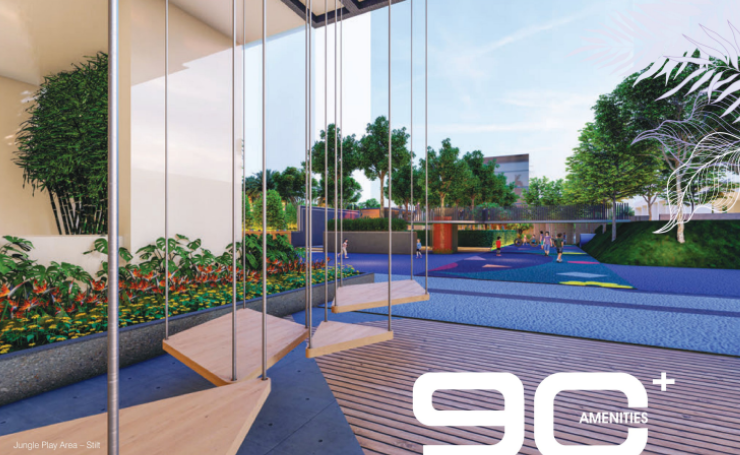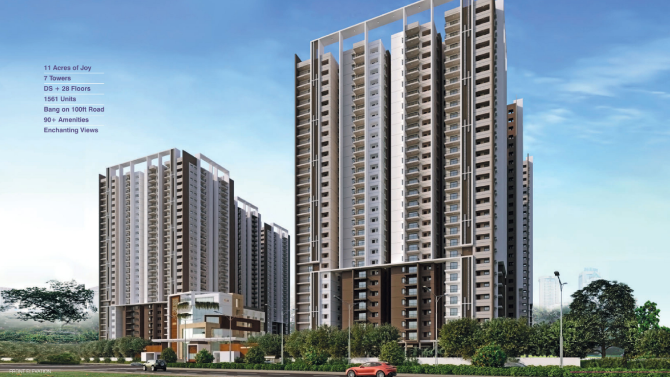 A gated, 28‑storey community in Tellapur on 100 ft road with 90+ amenities including a 45,000 sq.ft clubhouse, 10,000 sq.ft sports complex & 3.5‑acre central park.